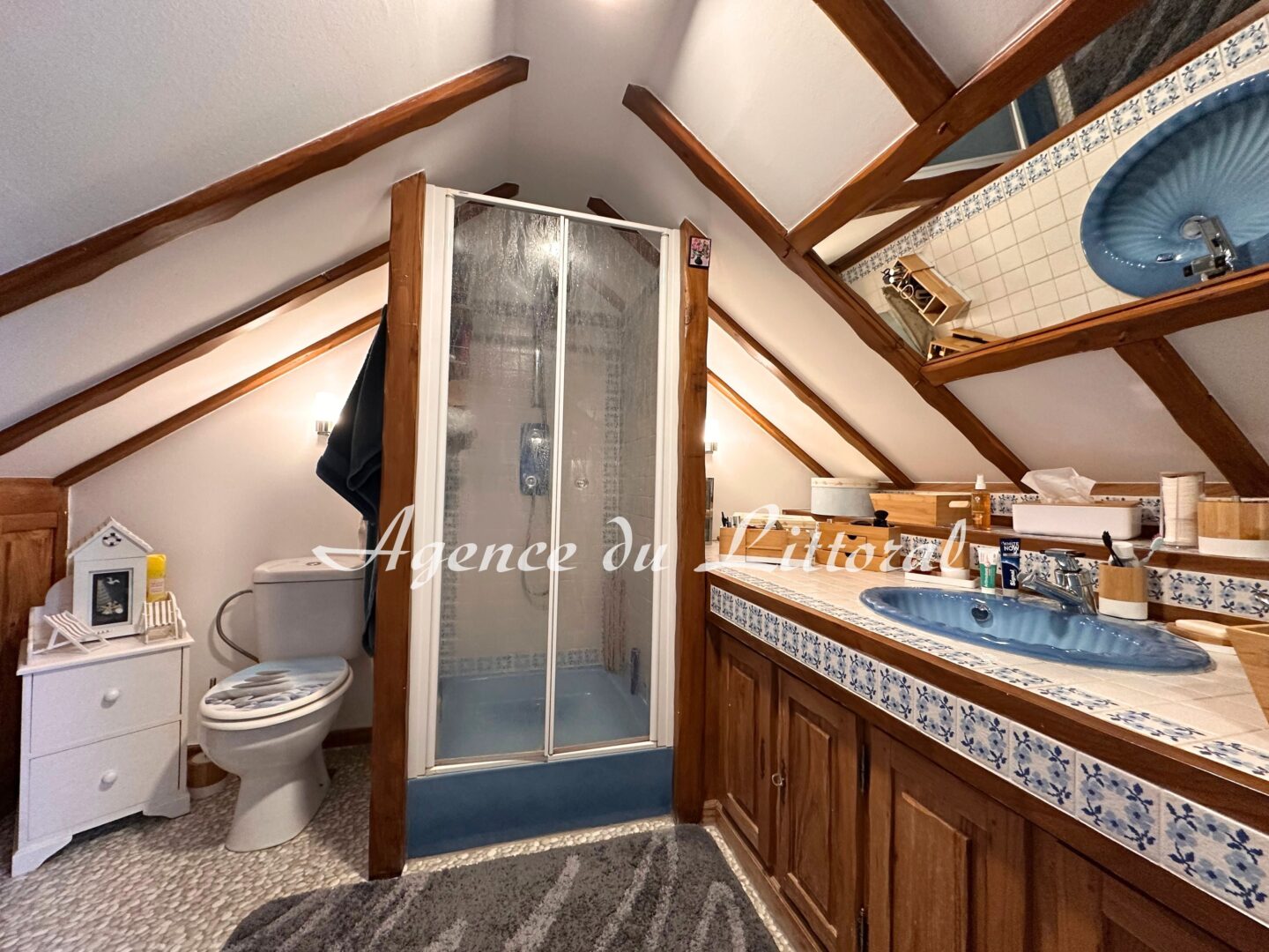 Toujours au rez-de-chaussée, vous trouverez une salle de d’eau équipée d’une douche, d’un lavabo et de toilettes, ainsi que deux chambres confortables, idéales pour accueillir famille et invités ou aménager un espace bureau selon vos besoins.
